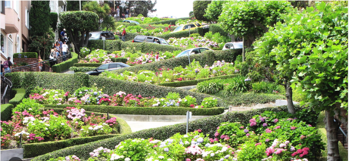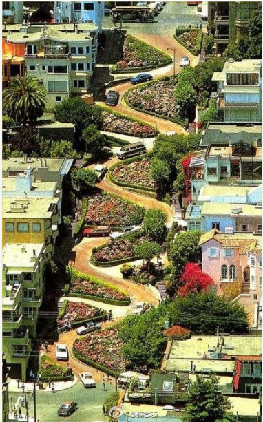 九曲花街被誉为“世界上最弯曲的街道”,是旧金山极受欢迎的地标之一。每年,数以百万计的游客步行或驾车经过它的八个急转弯。它被俄罗斯山的豪宅、精心修剪的景观和鲜花环绕,也是该市风景优美的街道之一。从山顶俯瞰旧金山湾、海湾大桥和科伊特塔令人叹为观止的景色。